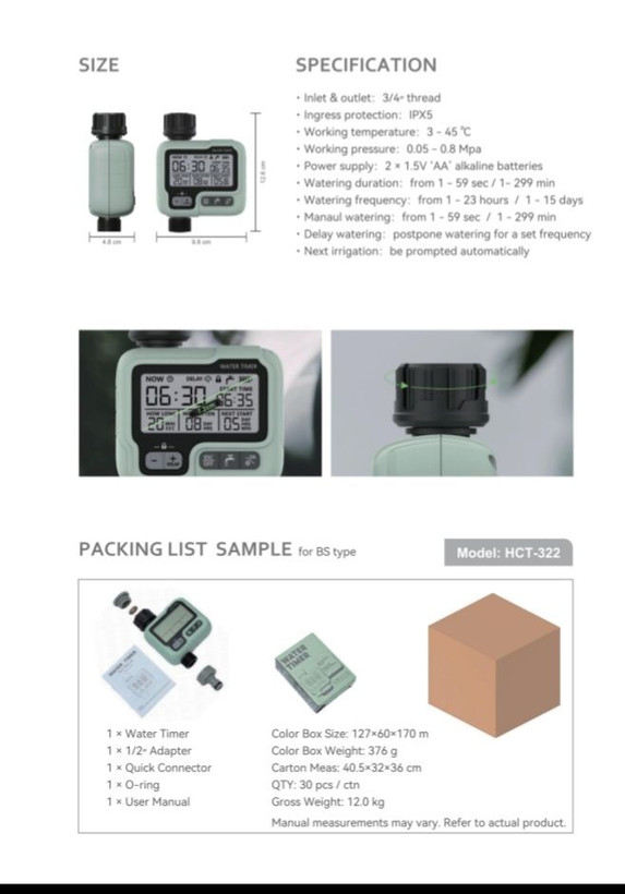 تایمر دیجیتال آبیاری HCT-322 یک راهکار ساده و هوشمند برای مدیریت زمان آبیاری است. با این تایمر میتوانید آبیاری گیاهان خود را بهصورت خودکار و منظم انجام دهید و بدون نگرانی از کمآبی یا مصرف بیشازحد آب، رشد سالمتری برای گیاهانتان فراهم کنید.