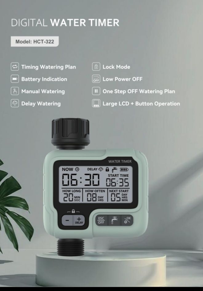 تایمر دیجیتال آبیاری HCT-322 یک راهکار ساده و هوشمند برای مدیریت زمان آبیاری است. با این تایمر میتوانید آبیاری گیاهان خود را بهصورت خودکار و منظم انجام دهید و بدون نگرانی از کمآبی یا مصرف بیشازحد آب، رشد سالمتری برای گیاهانتان فراهم کنید.
