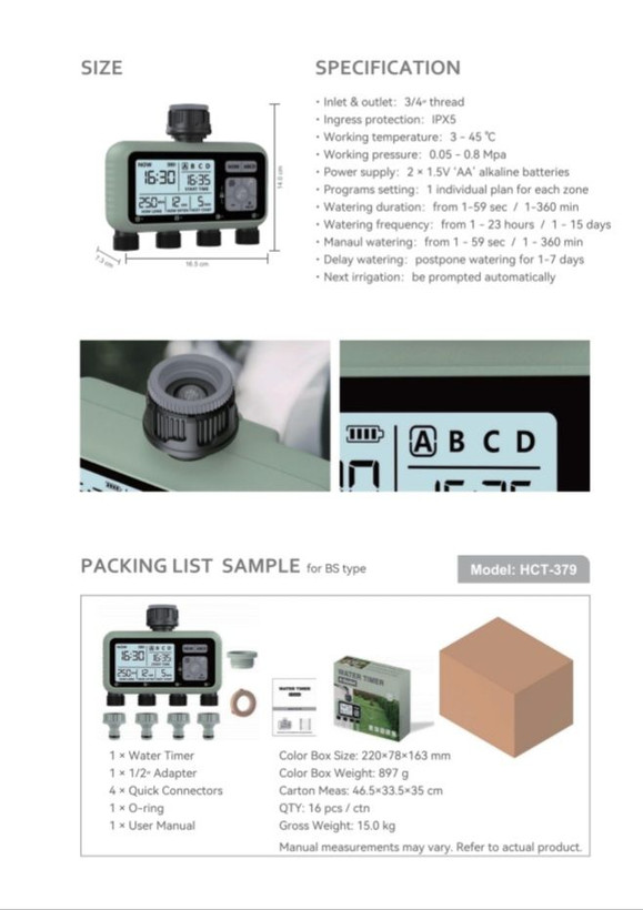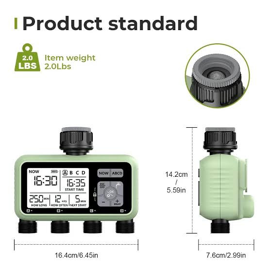 این تایمر یک محصول دقیق و مدرن برای آبیاری خودکار انواع فضاهای سبز است؛ طراحی آن بهگونهای انجام شده که علاوه بر کاربری آسان، انعطافپذیری بالایی در تنظیم برنامههای آبیاری ارائه دهد.